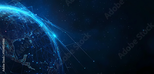 Digital representation of Earth surrounded by blue glowing data points and geometric lines, symbolizing technology, global networks, and advanced communication systems.