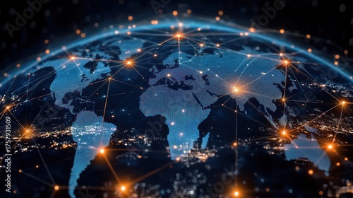 Digital representation of Earth with illuminated network connections symbolizing global communication and data exchange across continents in a futuristic setting