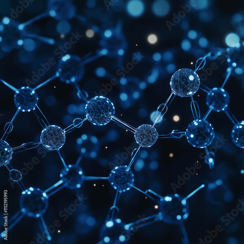 Digital representation of interconnected molecules in blue tones, showcasing intricate details and futuristic aesthetic. This captures essence of molecular structures and scientific exploration