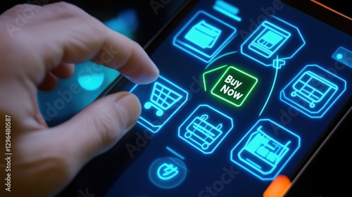 Digital shopping action engaging mobile experience with interactive buy now feature in a high-tech environment