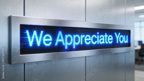 signs, appreciation, digital, message, office, modern, blue, display, technology, wall, workplace, greeting, text, message board, communication, gratitude, indoor, contemporary, lighting, electronic, corporate, positive, environment, teamwork, encouragement, support, employee, motivational, recognition, friendly, welcoming, business, interior, sleek, design, professional, inspirational, stylish, signage, connection, interaction, horizontal, bright, text message, uplifting