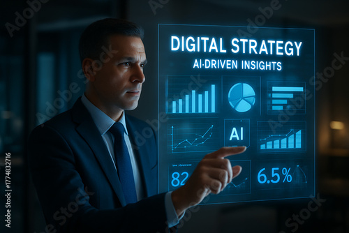 Digital Strategy and AI-Driven Insights Displayed on Futuristic Data Dashboard
