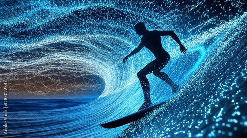 surfing, wave, digital, ocean, water, technology, innovation, man, silhouette, board, riding, blue, light, abstract, energy, future, datum, network, connection, cyber, virtual, glow, night, sea, current, motion, speed, dynamic, artistic, creative, modern, style, design, graphic, illustration, visual, art, fantasy, science, fiction