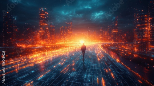Digital technology design with a sleek blue theme, featuring intricate grid patterns and modern AI visuals
