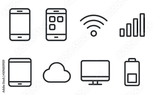 Digital technology icons: smartphone, wifi, battery, cloud, tablet, computer, signal