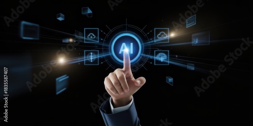 Digital Touch: A finger points towards a digital AI interface, surrounded by an array of virtual icons, symbolizing innovation and technological advancement.
