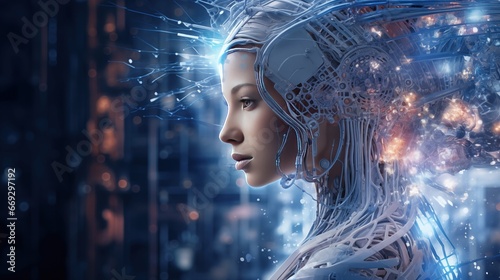Digital transformation concept. A woman with digital cyber circuits and cables as part of her.