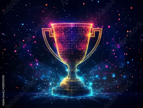trophy, award, digital, glowing, cosmic, abstract, technology, innovation, victory, success, futuristic, geometric, mesh, light, neon, winner, excellence, achievement, graphic, design, illustration, three-dimensional, modelling, rendering, art, celebration, modern, background, glow, future, concept, science fiction, space, star, point, line, network, datum, digital artwork, colourful, abstract design