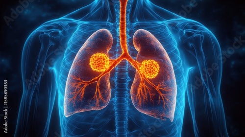 Digital visualization of human lungs with highlighted bronchial tree and distinct bright areas in both lungs indicating potential abnormalities or infections