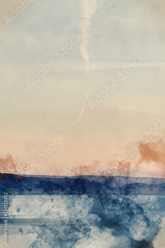Digital watercolor painting of Stunning landscape image of pastel color sunset over ocean giving lovely soft dreamy relaxing feel