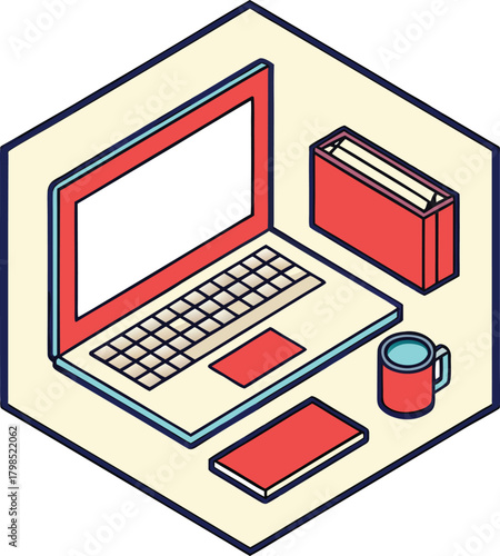 laptop, computer, notebook, mug, desk, technology, accessory, contemporary, workstation, office, personal computer, contraption, digital, screen, keyboard, touchpad, device, book, hot drink, drink, cyberspace, information, communication, working, study, business, minimalist, creative, design, graphic, layout, online, connection, modern, simple, clean, abstract, tech, element, art, illustration, isometric, workplace