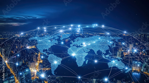 digital world map showcasing global connectivity and network interactions, illuminated by city lights at night, evokes sense of modern technology and interconnectivity