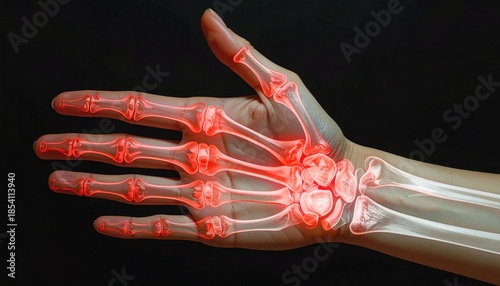 hand, bone, skeleton, x-ray, medicals, anatomy, health care, orthopedics, arthritis, pain, inflammation, physiology, diagnostic, imaging, wrist, bod, biology, science, clinical, therapy, treatment, medicine, doctor, hospital, wellness, innovation, digital artwork, illustration, high contrast, vibrant, pharmaceutical, injury, fracture, recovery, professional, cinematic
