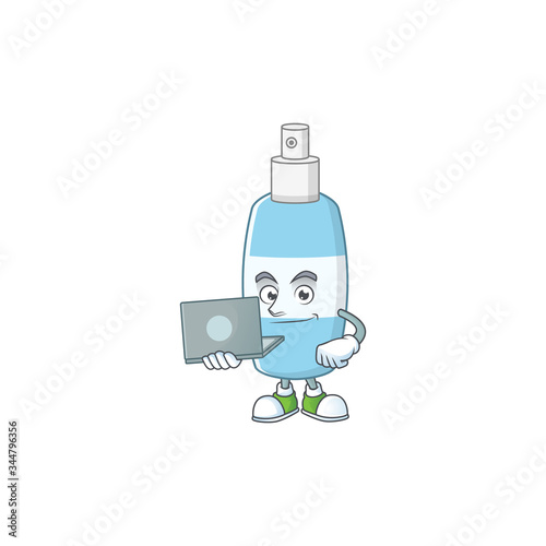 Diligent spray hand sanitizer mascot design style working from home with laptop