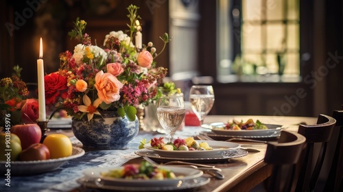 dining, blurred, rustic, illustration, room, wooden, table, floral, arrangement, vintage, tableware, intimacy, friends, family, meal, conversation, warmth, conviviality, life events, background, cosy, ambience, decor, farmhouse, charme, gathering, natural, texture, inviting, homely, atmosphere