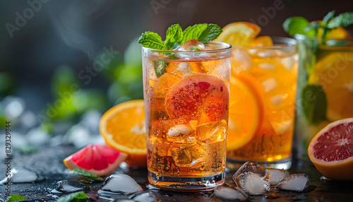 drink, glasses, cocktail, christmas, fruit, ice, juice, alcohol, cold, beverage, holiday, decoration, fresh, red, refreshment, water, light, party, sweet, cool, celebration, berry, strawberry, bar, liquid