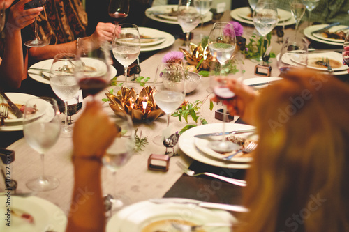 indoor, horizontal, goggles, gathering, friends, food, event, elegant, eating, dinner, chicken, cheer, champaign, bubble, wine, toast, table, several, setting, salad, rustic, red, prepared, people, party, meal, lifestyle