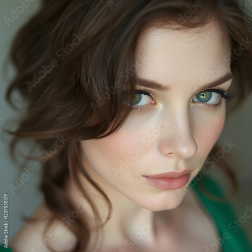 Diosa Esmeralda: Belleza Hipnótica con Cabello Oscuro y Piel Radiante