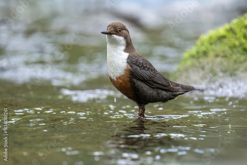 dipper, water, closeup, river, stream, rock, stone, side, front, blurred background, copy space, white, brown, scotland, britain, britain, britain, contrast, springtime