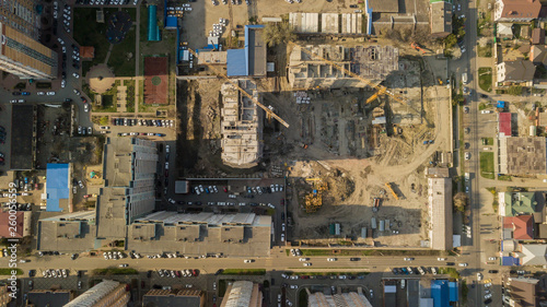 Directly above view of construction of modern high-rise buildings. Phased construction of structures.
