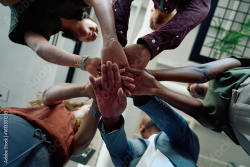 Directly below closeup of diverse business people stacking hands in office during daytime