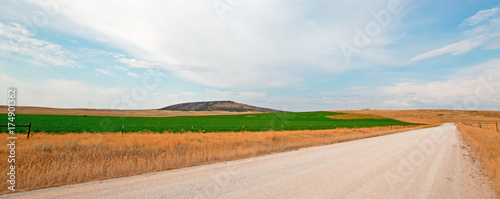 Dirt country road next to uncut Alfalfa field in Montana United States