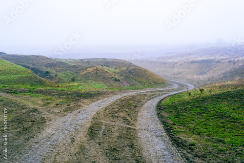 dirt muddy road wet Puddle countryside autumn fall green grass steppe after rain Tire tracks beautiful landscape Moldova Causeni Extreme path rural Broken impassable pasture