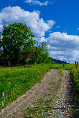 meadow, road, field, country, sky, landscape, rural, nature, horizon, green, farm, agriculture, countryside, blue, summer, dirt, plant, grass, spring, season, beauty, background, beautiful, path, sunlight, track, cloud, natural, hill, bright, nobody, lane, environment, sun, way, dirt road, land, dramatic, tree, scene, farmland, farming, scenery, house, view, springtime, scenic, sunny