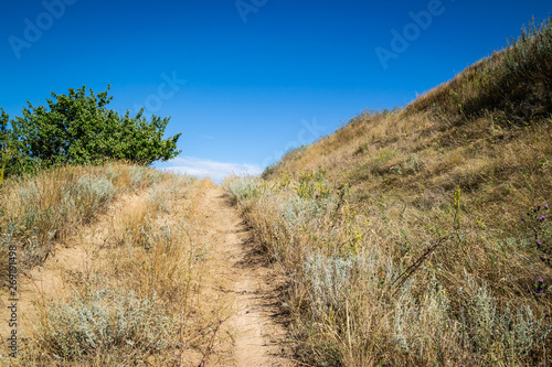 Dirt road overgrown with dry grass leading to the top of the hill.on a Sunny summer day.