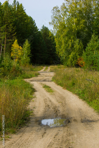 Dirt sandy road winds through the autumn forest. There's a puddle on the road after a recent rain