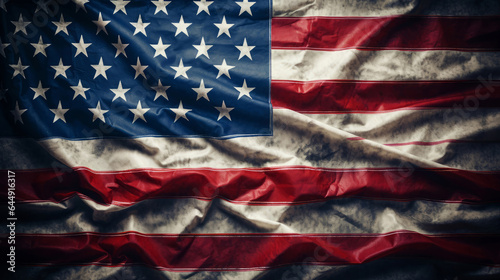 Dirty flag, vivid red and blue colour in lowlight. Red, white and blue United states patriotism.