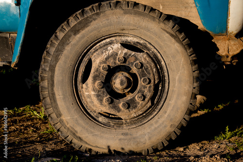 Dirty truck's wheel background soil sunshine day
