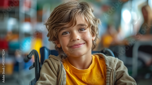 Disabled schoolboy in wheelchair looking and smiling. Young boy with disability in inclusive school.