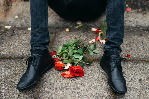 disappointment,fashionable young man sitting on the sidewalk, crushed roses