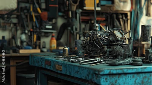 engine, workshop, tool, workbench, mechanic, repair, part, automotive, machinery, garage, metal, steel, grease, oil, rust-eaten, vintage, old, cluttered, messy, equipment, technology, industry, engineering, craft, manufacturing, construction, maintenance, service, hardware, spanner, wrench, plier, screwdriver, hammer, bolt, nut, gear, piston, cylinder, car, vehicle, industrial, background, texture, detail, dark, blue, dirty