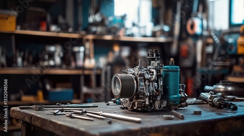 engine, part, disassemble, workshop, repair, mechanic, tool, maintenance, vehicle, machinery, industrial, technology, automotive, repair shop, technician, equipment, service, fuel, injection, diesel, clean, metal, garage, work, bench, wrench, machine, detail, detailing, close, up, precision, quality, control, modern, modernism, industry, engineering, repairing, fixing
