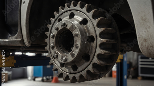 Disassembled truck axle with visible gear teeth placed on hydraulic lift in service area