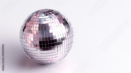 Disco ball with vivid mirrored tiles on white backdrop, creating bright reflections, bringing festive energy and dynamic vibes, ideal for celebration themes