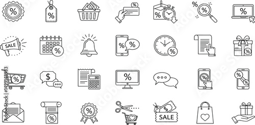 Discount icon set. Shopping related line icons: sale, coupon, shop, e-commerce, promotion, outlet, offer, credit, price card and more.