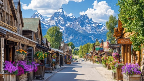 Discover the scenic charm of a historic town surrounded by majestic mountains and vibrant flower displays on a sunny day