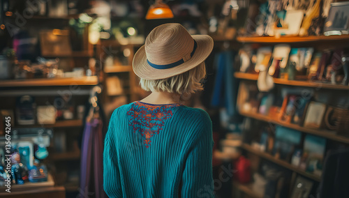 Discovering Treasures: A person explores the shelves of a shop, a hat framing her hair as she is fully immersed in the unique collection, capturing the spirit of discovery and nostalgia.
