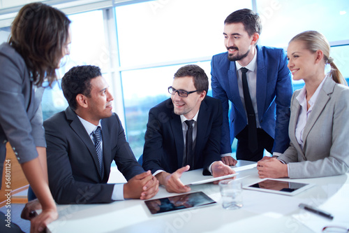 businessperson, people, business, group, team, meeting, man, female, woman, businesswoman, person, discussing, white, working, partner, young, businessman, confident, professional, job, male, cooperation, communication, interaction, contemporary, corporate, executive, occupation, associate, adult, explaining, manager, employee, company, attention, collar, men at work, planning, tied-up, employment, sharing, idea, touchpad, using, digital, tablet, happy, smiling, positive, cheerful