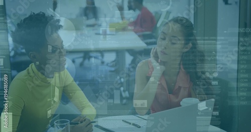 Discussing pair wearing green top and coral blouse at office table with laptop and data overlays