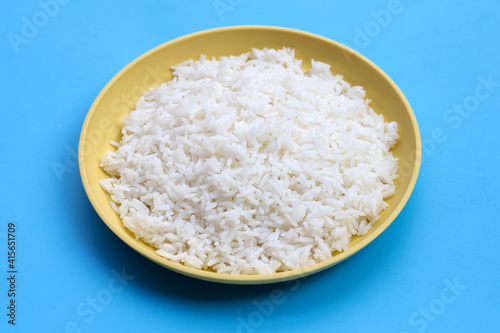 Dish of rice on blue background.
