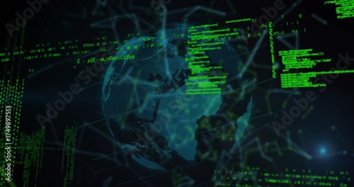 holographic, globe, rotating, three-dimensional, network, green, code, futuristic, technology, cyberspace, datum, visualisation, digital, abstract, innovation, dotted, interface, alphanumeric, scrolling, vertical, horizontal, block, semitransparent, semitransparent, line, glowing, node, point, multidirectional, grid, connection, global, flow, cyber, virtual, environment, floating, dark, background, space, column, segment, filament