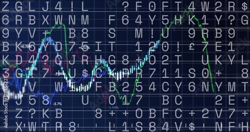 market, trend, trading, screen, line, graph, percent, label, grid, finance, datum, technology, dashboard, investment, chart, digital, interface, blue, dark, white, alphanumeric, character, letter, number, symbol, column, coloured, green, magenta, fluctuating, percentage, change, key, point, curve, rise, fall, code, overlay, display, visualisation, composite, pattern