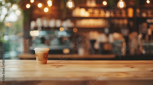 Disposable Coffee Cup on Wooden Table in Coffee Shop