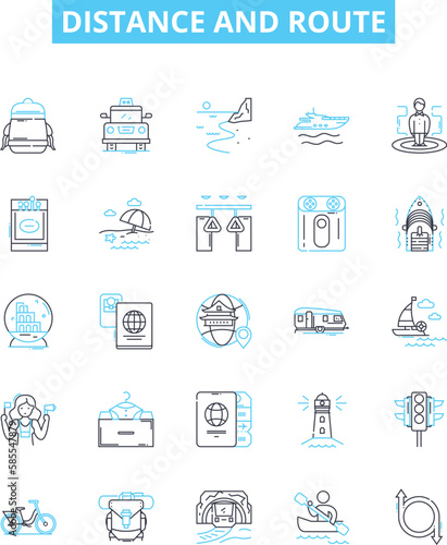 Distance and route vector line icons set. Distance, Route, Tracking, Map, Measurement, Path, Plan illustration outline concept symbols and signs