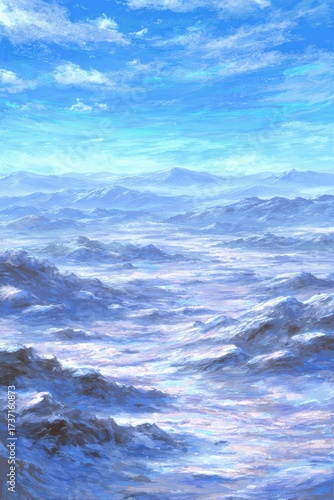 landscape, mountain, sky, blue, white, cloud, mist, fog, nature, view, digital, art, painting, graphic, illustration, horizon, vale, peak, rolling, hill, distant, colours, light, atmosphere, peaceful, serene, quiet, calm, dreamlike, fantasy, vibrant, pastel, artistic, style, scene, scenic, mountain, range, winter, snowy, cold, wintery, misty, dreamy, computer, graphic, design, piece, image