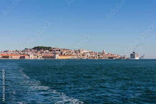 architecture, building exterior, built structure, capital city, city, city life, city landscape, clear sky, blue, cruise ship, day, distant, europa, harbor, horizontal, lisboa, motion, no people, outdoors, passenger ship, photo, portugal, rippled, river, river bank, skyline, sunlight, tour tourism, town, city landscape, transportation, travel, travel destination, vacation, arousing, water, waterfront